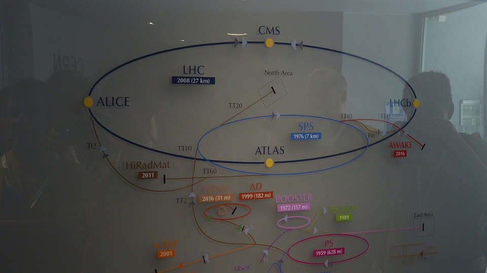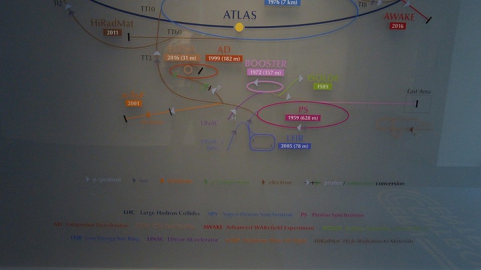48 Schéma urychlovače a umístění hlavních experimentů (LHC = Large Hadron Collider, CMS = Compact Muon Solenoid, ALICE = A Large Ion Collider Experiment pro studium vlastností kvark-gluonového plazmatu, tj. stavu hmoty bezprostředně po velkém třesku, LHCb = Large Hadron Collider Beauty pro studium kvarků, ATLAS = A Torroidal LHC Apparatus, mnoho účelový a největší detektor v CERNu (průměr 25 m, délka 46 m, hmotnost 7 000 tun (polovodičové pixelové detektory pro toto zařízení byly vyrobeny v Rožnově p. R. ve firmě ON Semi)), AWAKE = Advanced WAKEfield Experiment. - čtvrtek, 15. května