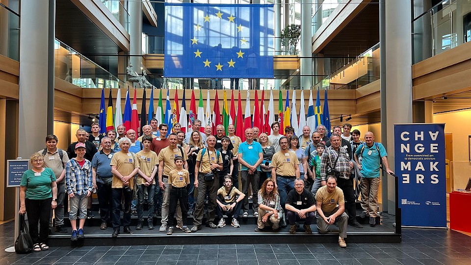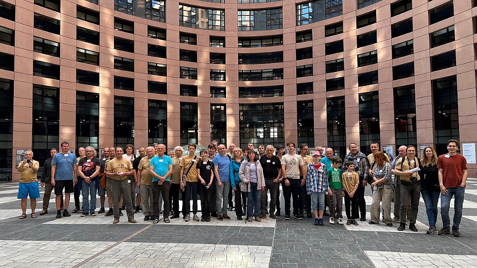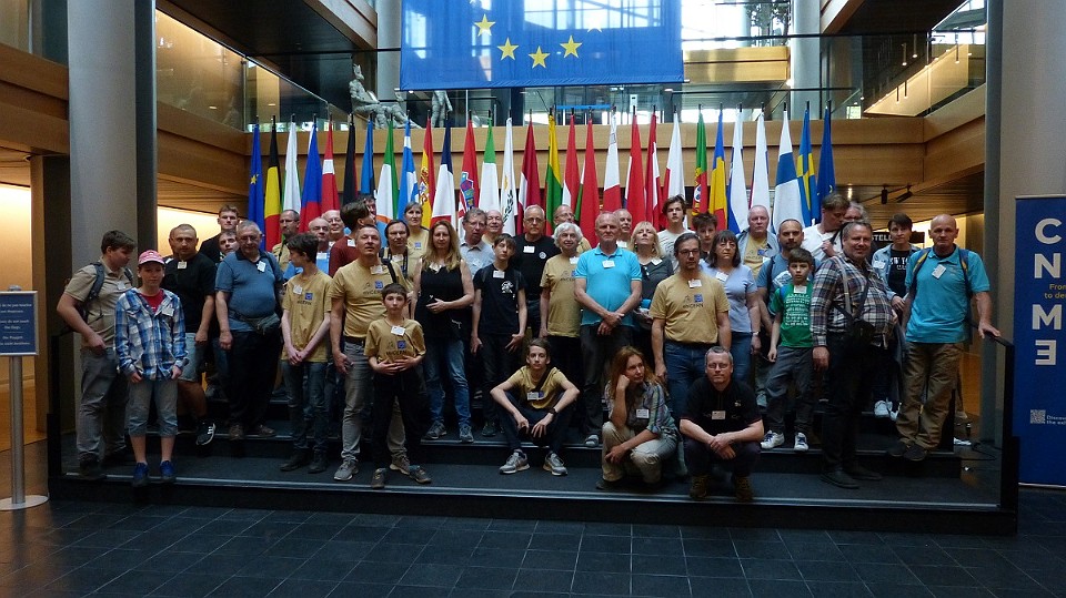 134 Společná fotka účastníků zájezdu na dvoraně budovy Evropského parlamentu. - pátek, 16. května