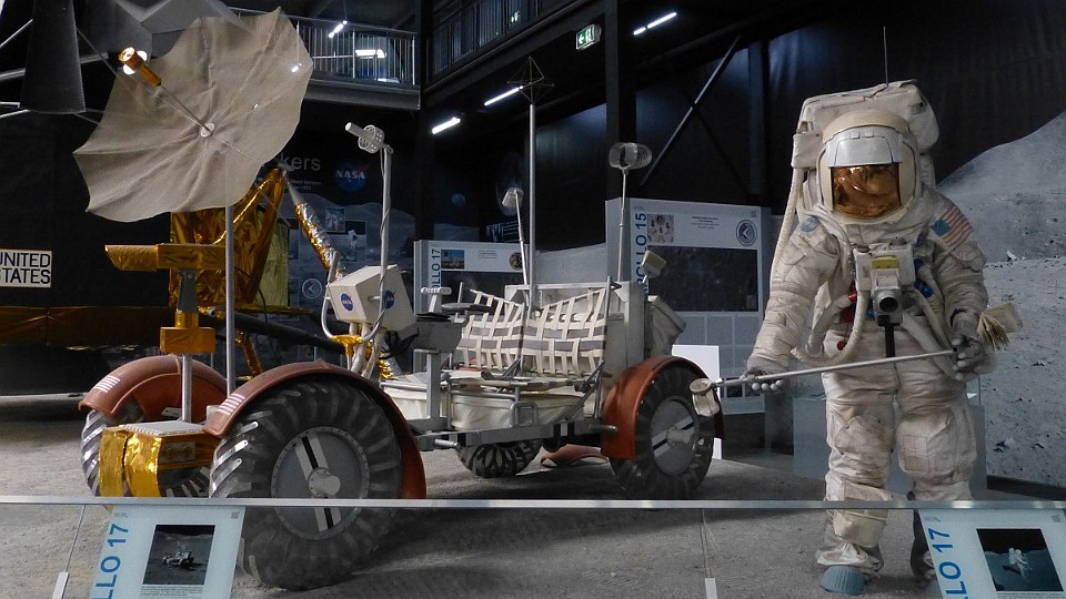 177 Pohled na měsíční modul, vozítko, astronauta a návštěvníky pro představu měřítka. - sobota, 17. května